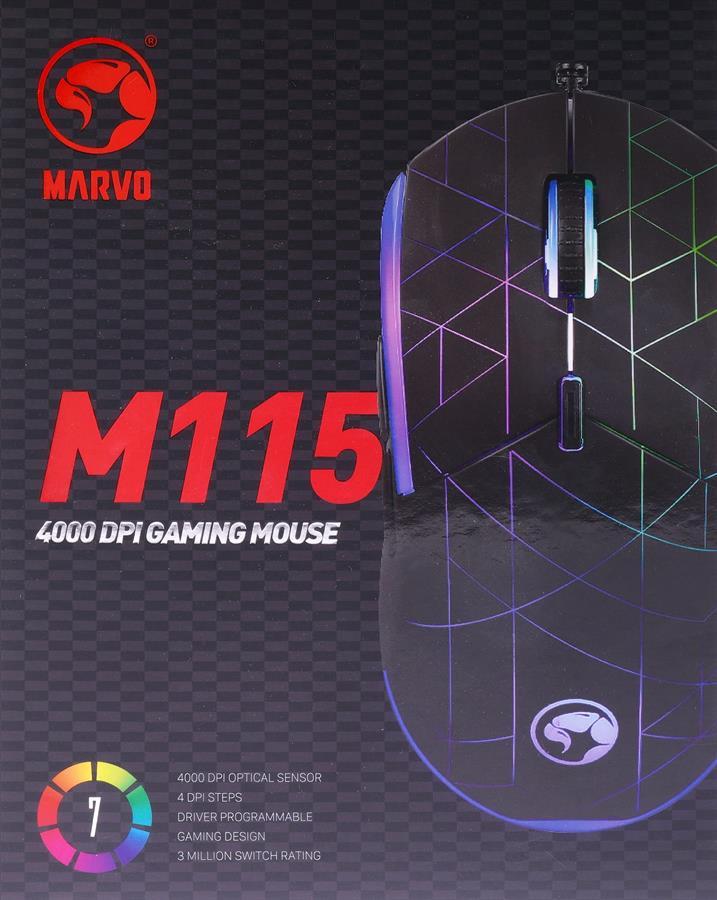 MARVO Scorpion M115 Gaming Mouse USB 2.0 7 Colours LED Adjustable up to 4000 DPI Optical Sensor Gaming Quality with 6 Programmable Buttons